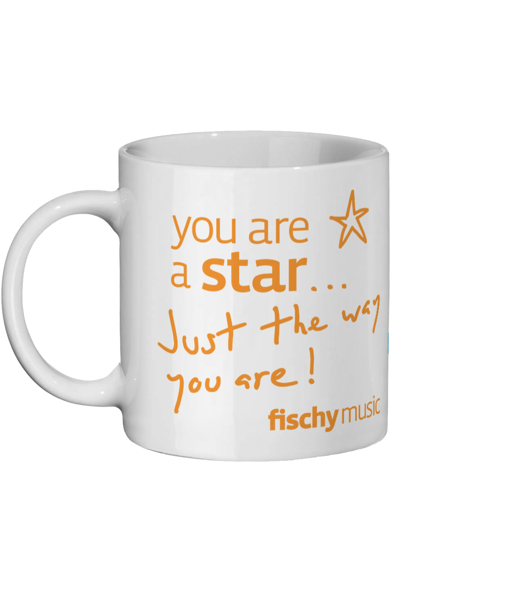 A white mug with the Fischy Music blue splash, with the choice of 3 Fischy song lyric designs: